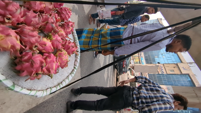 A street vendor displays a cart piled high with pink dragon fruit. The vendor wears a blue and gold lungi and light-colored shirt. Shoppers browse nearby. Buildings line the street in the background. Another man in a plaid shirt and black pants stands close to the fruit. The scene appears to be a bustling outdoor market.