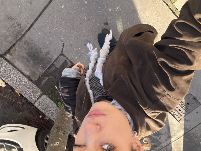 An overhead, slightly angled photographic image depicts an individual posing for a selfie on an urban sidewalk during daylight. The individual, appearing to be an adult female, occupies the majority of the frame, facing the camera. She has light-colored hair, a silver hoop earring in her right ear, and a silver nose ring in her left nostril. Her left eye is closed in a wink, while her right eye is open and focused on the camera; orange eyeshadow is visible around the right eye. Her lips are slightly pursed. She wears a brown jacket over a grey and black striped top, with a textured light-grey scarf draped around her neck. Her left hand, with dark nail polish on the visible fingers, is partially seen near her side. The background shows a concrete and asphalt sidewalk with cracks, illuminated by strong sunlight from the left, casting shadows. A dark rectangular metal utility cover, partially inscribed with "METER," is visible on the sidewalk to the left of the individual. To her right, a tree trunk rises from the sidewalk. Beyond the tree, a white passenger vehicle is parked, with its front bumper and headlight visible. Dry leaves and soil are present around the base of the tree and along the curb, with some green moss or vegetation in the cracks. The scene is located in the city of Unknown, Unknown.