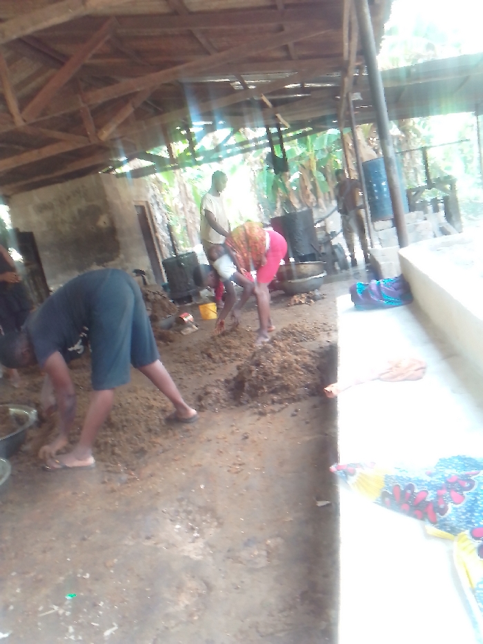 This image depicts an outdoor or semi-open-air processing facility in the city of Unknown, Unknown. Five individuals are present, engaged in manual labor on an uneven, muddy dirt floor covered with piles of brown fibrous organic material. In the foreground left, an individual wearing a dark top and dark shorts is bent over, appearing to process material within a large metal bowl or directly on the ground. In the midground, a male wearing a light-colored t-shirt and shorts stands near a female in a patterned top and red shorts, who is also bent over, handling the fibrous material on the ground. Another individual is partially visible to the far left. In the background right, a male in a light-colored top stands beside industrial machinery, including a large vat and a dark blue barrel. The structure features a visible wooden beam roof, concrete wall sections, and a doorway in the background. Lush green foliage is visible outside the structure. Several pieces of folded, patterned fabric (Ankara print) are resting on a raised concrete ledge to the right of the scene. A yellow plastic bucket is visible on the ground in the midground. The scene is illuminated by daylight, with some strong sunlight creating bright reflections.