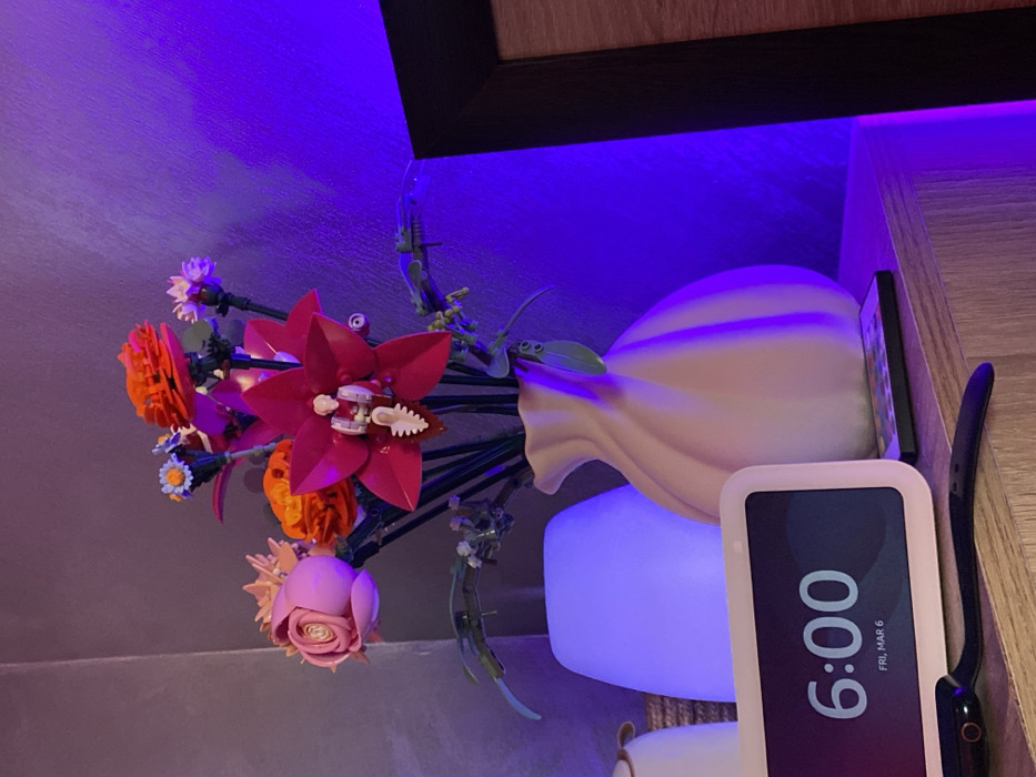 The image displays an indoor scene within the city of Silistra, Bulgaria, featuring a collection of items arranged on a light-colored wooden shelf. A pale pink or beige ceramic vase with a ribbed, ruffled design holds a bouquet of artificial flowers, identified as LEGO Botanical Collection models. The flowers include a prominent dark pink orchid, multiple orange and pink rose-like blossoms, and smaller blue and white daisy-like flowers, all with green stems and leaves. To the left of the vase, a white, translucent, conical lamp or diffuser emits a soft blue-purple light. In front of this lamp, a white digital smart display device shows "6:00 FRI, MAR 6" on its dark screen. A black fitness tracker band lies curved on the shelf beneath the smart display. The background wall on the right side is illuminated by an intense purple light, suggesting LED strip lighting, which casts a glow onto the adjacent wall and objects. A portion of a black-framed object with a light wooden inner edge is visible on the far right.