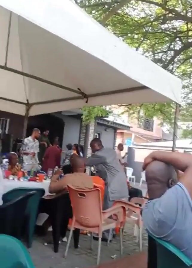 n outdoor gathering of people. A white canopy covers several tables where individuals are seated, some eating and others interacting. A man in a gray outfit is standing and appears to be assisting at one of the tables. In the foreground, a man in a blue shirt rests with his hands behind his head. The scene is outdoors, with trees providing shade and nearby buildings. The overall atmosphere seems relaxed and social.