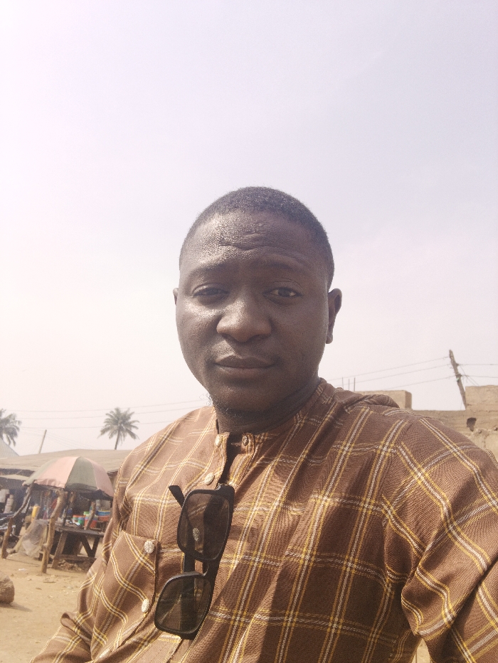A medium shot of a man wearing a brown and yellow plaid shirt with sunglasses hanging on the front. The background shows an outdoor market setting with stalls, umbrellas, and palm trees under a hazy sky. He is looking directly at the camera. The composition is a selfie-style photo.
