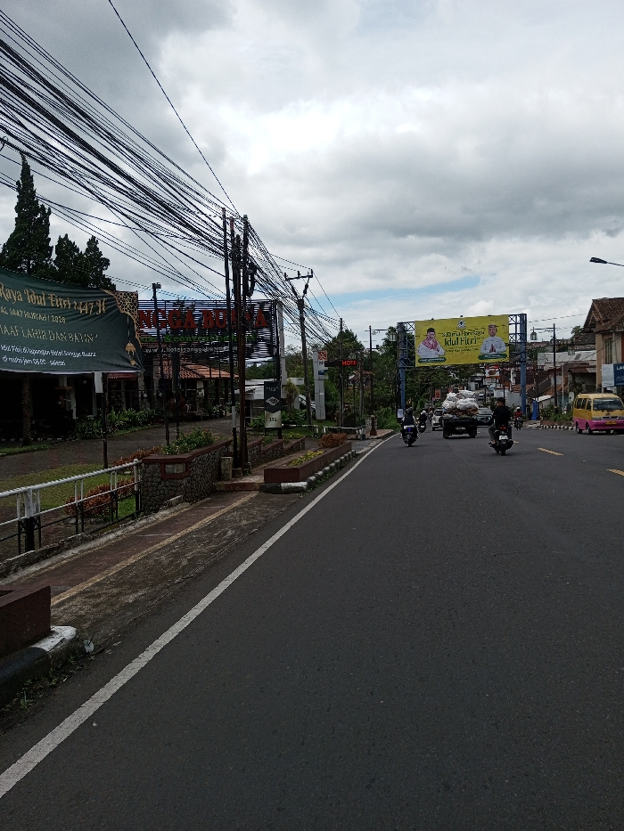 The image depicts a street scene in the city of Taohom, Laos, under a predominantly overcast sky with scattered grey clouds. An asphalt road, visible in the foreground and extending into the distance, features a solid white line delineating its left edge. On the left side of the road, a raised concrete median or sidewalk runs parallel, equipped with low stone walls, planter boxes, and a white metal guardrail. Directly above this area, a dense network of black utility cables crisscrosses horizontally, supported by multiple vertical utility poles. Further left, beyond the median, several structures and signs are present. A large green banner displays partially visible white text, including "RAYA IDUL FITRI 1447 H" and "MAAF LAHIR DAN BATIN." Adjacent to this, a prominent sign for "NAGA DUNIA" and "JENDELA ALAM" is visible, along with text referring to "www.hotelsangria." A red "HOTEL" sign is also present further down the street on the left. Tall, slender conifer trees and other greenery are visible in the background on this side. Vehicular traffic is present on the road. In the mid-ground, three motorcycles are in motion: two in the left lane, and one in the right lane. Each motorcycle has at least one individual rider. A dark-colored flatbed truck or lorry, heavily loaded with numerous white sacks or bundles, travels in the right lane. To the far right, a yellow and pink minivan is visible. In the background, a large yellow billboard spans horizontally across the road, displaying images of two men and the text "Selamat Hari Raya Idul Fitri." Buildings with varying roof types line the street in the distance.