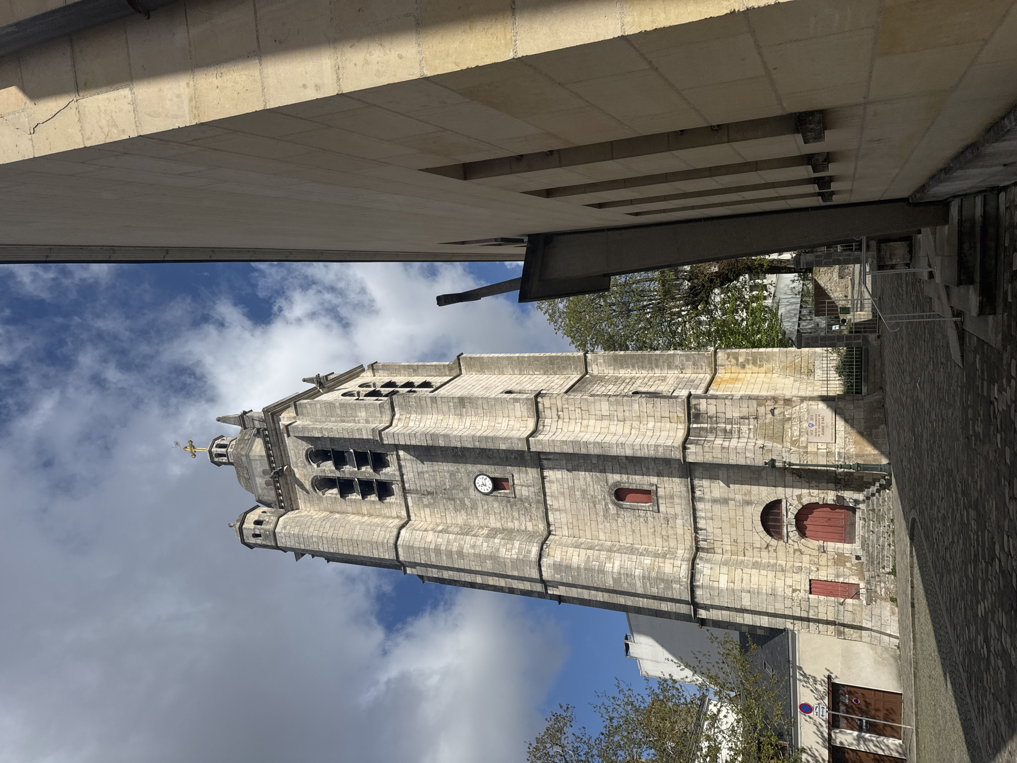 The scene depicts the Église Saint-Aignan, specifically its bell tower, located in Orléans, France, under a partly cloudy blue sky. The central subject is a tall, octagonal bell tower constructed from light-colored, coursed masonry blocks. At the base of the tower, an arched main entrance with red-painted wooden doors is accessible via a set of worn stone steps. To its left, a smaller, square red-painted wooden door is set into the stone facade. A dark green, fluted lamppost stands to the right of the main steps. Higher on the tower, a circular clock face with black Roman numerals is visible on the observer-facing side, displaying a time approximating 1:50. Above the clock, multiple levels feature arched openings, likely for bells. The tower culminates in a domed cap adorned with small corner turrets and a prominent golden cross finial. A commemorative plaque near the main entrance reads "1412-2012 / Sixième Centenaire / JEANNE D'ARC / Association des amis de S-Aignan". To the right of the bell tower, a modern, light-colored building with a smooth facade and vertical concrete supports runs parallel, partially obscured by strong shadows. This structure features multiple narrow, recessed vertical elements on its facade and concrete protrusions. A short, white-painted metal handrail leads to a raised platform against this building. A metal fence and gate separate the church grounds from an adjacent area. The ground in the foreground is paved with cobblestones. A road sign indicating "no parking" and "no stopping" is partially visible on the left side of the frame. Deciduous trees with green foliage are visible behind the church and partially on the left. The scene is illuminated by direct sunlight, casting distinct shadows across the cobblestones and building facades. No individuals are present in the depicted environment.