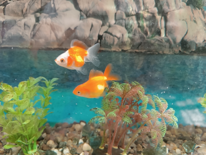 This image displays an indoor aquarium, situated in Kulata, Bulgaria. Two goldfish are captured in clear water, positioned in the mid-ground. The upper fish is white with irregular orange patches covering its head, dorsal region, and parts of its body, displaying clear fins. The lower fish is entirely orange, with a slightly lighter area on its ventral side, also possessing clear fins. Both fish are oriented to the right, appearing to swim horizontally. The aquarium's substrate consists of varied small, rounded pebbles and gravel. Artificial green leafy plants are clustered on the left side of the frame. On the right, a multi-stemmed artificial plant with reddish-brown trunks and green, textured fronds is visible. Numerous small air bubbles are scattered throughout the water. The backdrop of the aquarium features an artificial landscape depicting grey-brown rock formations above a blue-green watery area.
