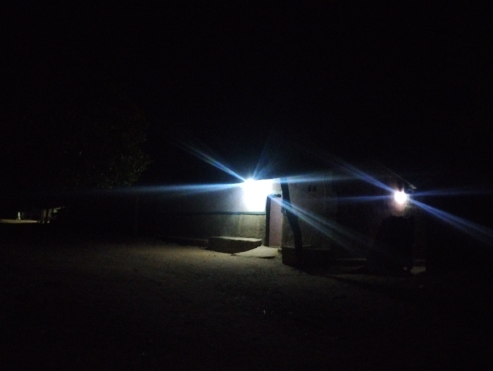 The image depicts a dimly lit nighttime scene in Bajoga, Nigeria, at the coordinates 10.852° N, 11.426° E. There is a small, one-story building illuminated by a single bright light. The light source is a bare bulb, casting a strong, focused beam. In the foreground, two figures are standing in front of the structure. Their features are obscured by the shadows. The surroundings are obscured by darkness, but there are indications of a dirt ground and some vegetation. The air is still and quiet. The scene suggests a typical rural setting in Nigeria.
