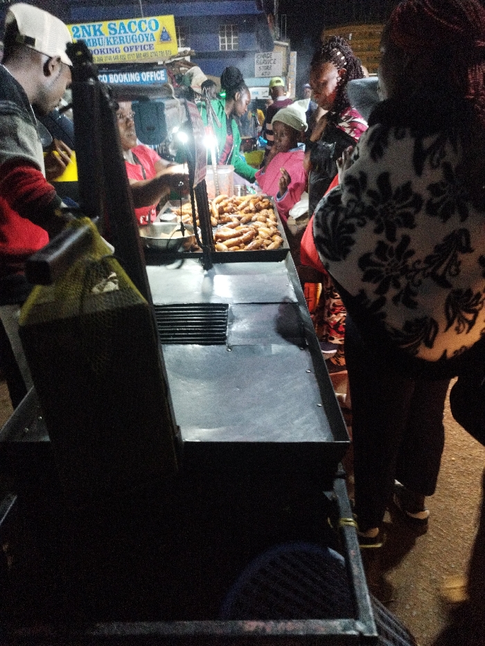 The image depicts a nighttime street food vending scene in Nyeri, Kenya, illuminated by artificial light