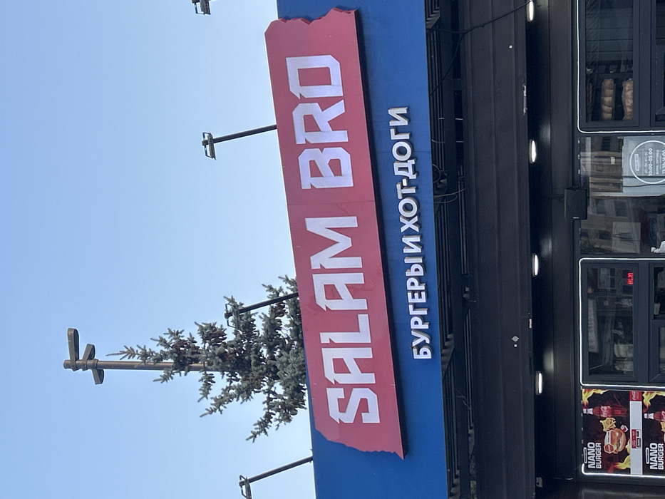 An exterior image depicts the facade of a fast-food establishment named "SALAM BRO" in Almaty, Kazakhstan, under a clear light blue sky