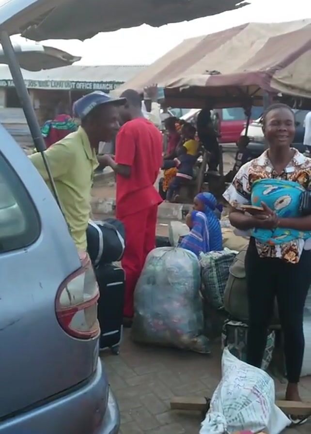 The video depicts a busy outdoor scene, possibly a transport hub or market, filled with people and luggage. A silver car is parked on the left side of the frame, with its trunk open. A man in a yellow shirt and blue cap stands near the car, talking to another man in a red uniform. A woman in a patterned shirt, black pants, and sandals is standing with her arms crossed, looking at a phone. Several large bags and luggage are scattered around on the ground. Behind the woman, another woman in a floral dress and headscarf is walking away from the camera. Several people are sitting at wooden tables under a tent-like structure in the background. A hill is visible in the distance. The general atmosphere suggests a bustling public area where people are preparing to travel.