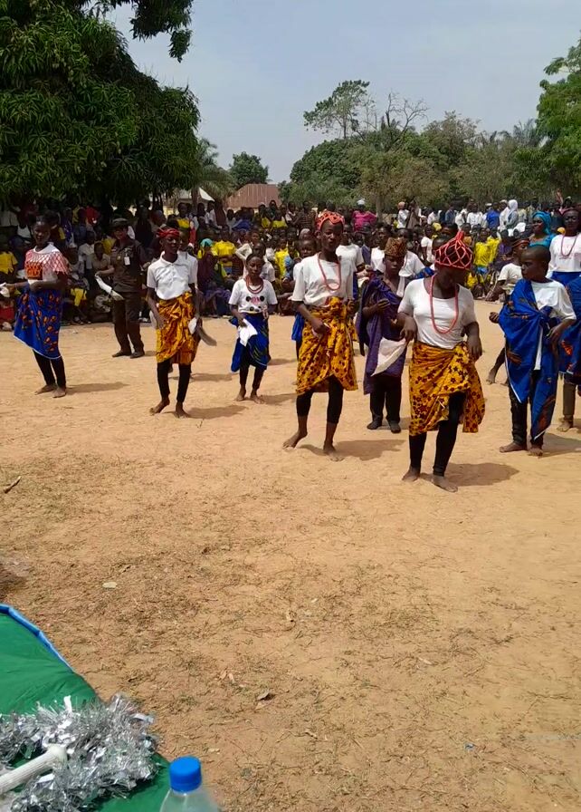 ground-level shot of a group of people performing a cultural dance. The dancers are arranged in several rows on a reddish-brown dirt surface. The dancers, mostly children, are dressed in colorful traditional clothing including white shirts, yellow-patterned skirts, and blue and white patterned wraps. Some of the dancers wear headgear. In the foreground, a man dressed in a patterned shirt and a red hat holds a cane and appears to be leading the dance. To the side is a crowd of people. The background includes green trees and a blue sky with some clouds. In the bottom right corner, there is a table covered with a green cloth, a water bottle, and some decorations.