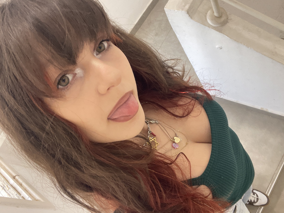 A young woman with brown hair, red highlights, and bangs poses for a selfie, sticking out her tongue