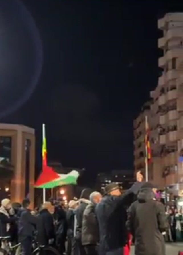At night, a crowd gathers in a city square, possibly for a demonstration or gathering. People are dressed in dark clothing, and several individuals wave flags, including a Palestinian flag and one with black, yellow, green, and red stripes. The crowd is looking up at the flags attached to poles. A multi-story building forms the backdrop, with lights visible in some windows. Streetlights illuminate the scene, and a bicycle stands nearby. The atmosphere is somewhat subdued, although there may be chanting or background noise.
