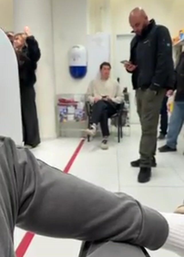 interior of a waiting room. A man with curly brown hair sits in a black plastic chair, legs crossed, looking at his smartphone. He wears a light beige sweatshirt with a small graphic design on the front, dark trousers, white socks with black stripes at the top, and scuffed sneakers. Behind him is a small wire cart containing various items and a hand sanitizer dispenser mounted on the wall. To his right, a bald man in a black jacket and olive-colored pants also looks at his phone. A line of red tape is visible on the floor. Other people are standing in the background. The camera appears to be held by someone seated, capturing their own gray pants leg and sock in the foreground.