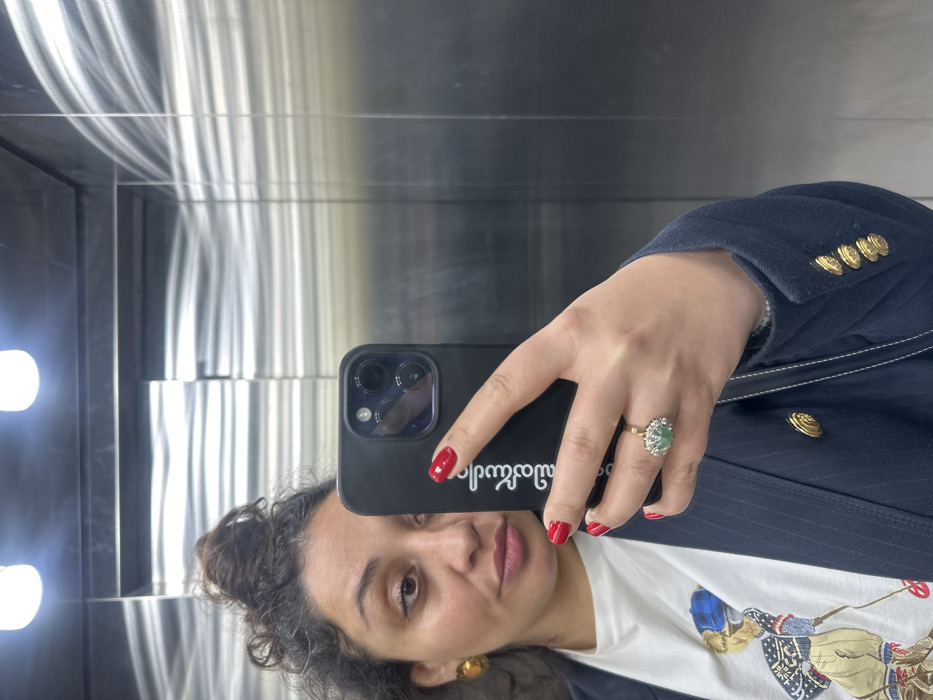 A woman takes a selfie in an elevator. She holds a black phone in her left hand. She has curly hair, and wears a white t-shirt, a navy blazer with gold buttons, and a gold ring with a green stone. Her fingernails are painted red. The elevator's walls are silver and have a light reflecting off them.