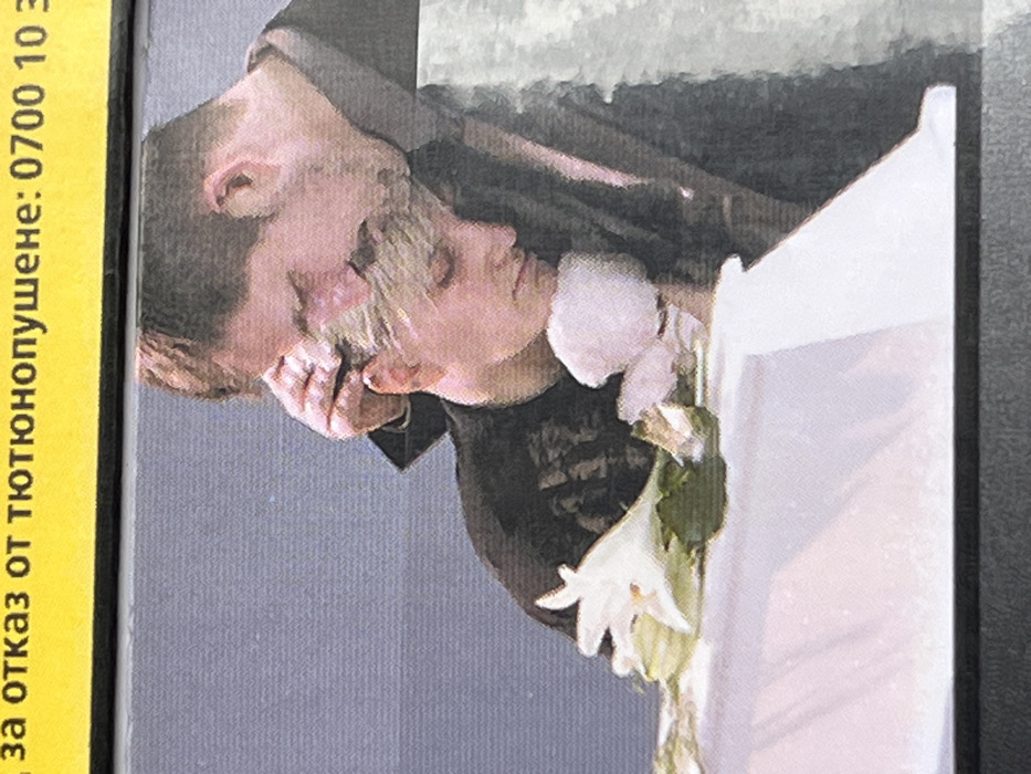 The image displays a scene occurring in Stara Zagora, Bulgaria. Two individuals are visible. A male with dark hair and a beard, wearing a dark suit jacket, stands behind and to the right, his right hand placed on the head of a second individual. This second individual has light blonde hair, wears a dark, possibly patterned, top, and has their head bowed forward, appearing to rest on a white, soft object. A white lily and other light-colored flowers are arranged on a white surface, possibly a draped coffin or table, in the foreground. The immediate background is a plain light grey-blue wall. A yellow banner with partial black Cyrillic text reading "за отказ от тютюнопушене: 0700 10 3" is visible along the top edge of the overall image.