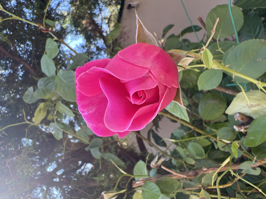 A close-up photograph captures a single, vibrant fuchsia-pink rosebud in a partially unfurled state, positioned slightly right of the frame's center. The rose's petals are tightly coiled at its core, gradually expanding outwards. Light green, subtly textured sepals are visible at the base of the bud. The rose is attached to a green stem, which features visible thorns, and is surrounded by dense green foliage from what appears to be a rose bush. In the mid-right background, a pale, light-colored vertical surface, possibly a wall, is visible. The upper background reveals a clear blue sky interspersed with blurred dark tree branches and foliage. Direct sunlight from the upper left illuminates the scene, casting prominent light rays and circular bokeh effects through the background. The scene is located in Sutomore, Montenegro.