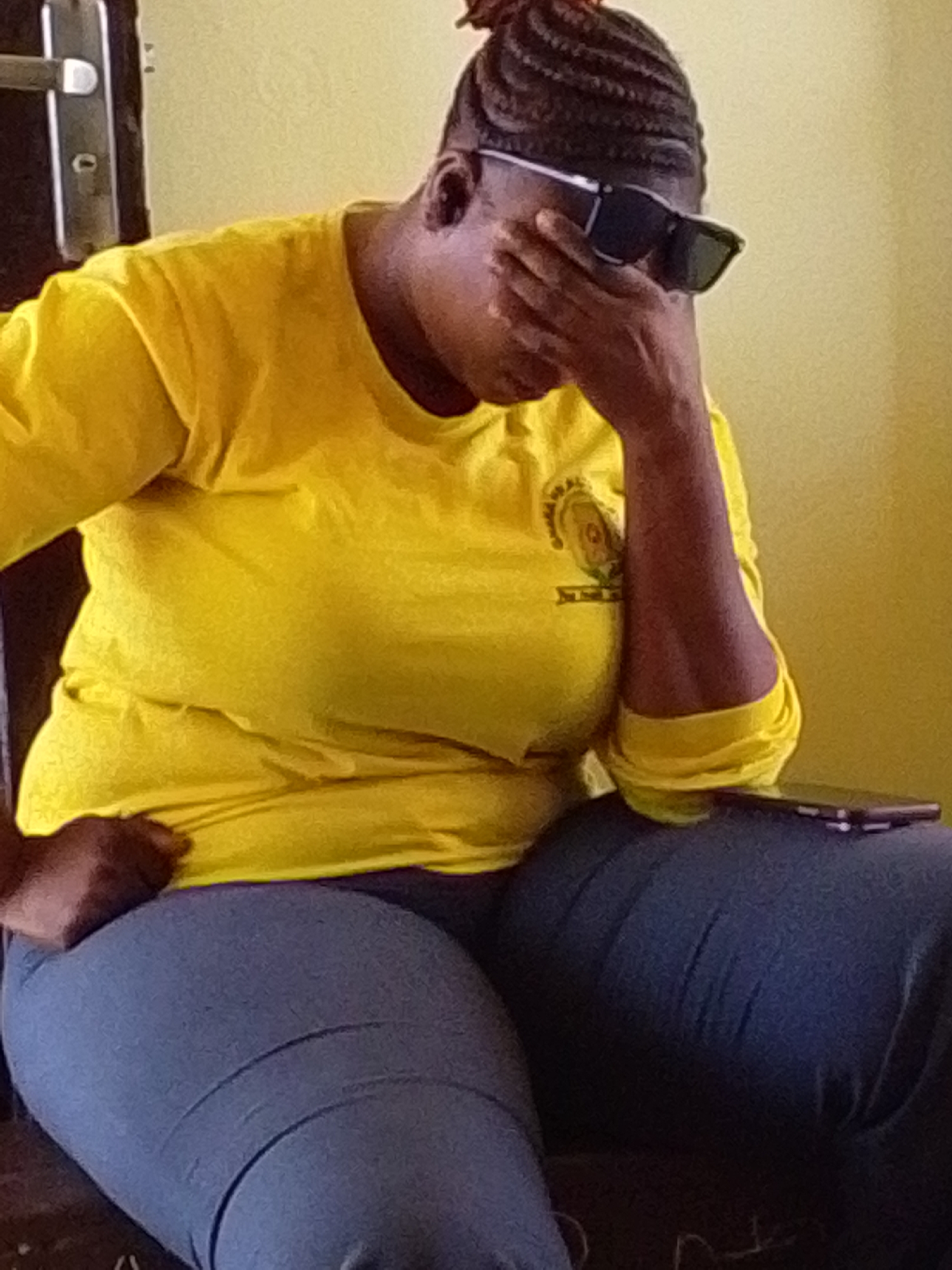 A person with dark skin and braided hair is seated in a chair. They are wearing a bright yellow long-sleeved shirt, dark sunglasses, and dark pants. The person has their left hand on their lap and their right hand covering the upper part of their face. A mobile phone is placed on the person's right thigh. The scene is indoors with light yellow walls. A dark-colored wooden door frame is visible in the background. The location is presumed to be the city of Dungu, Ghana.
