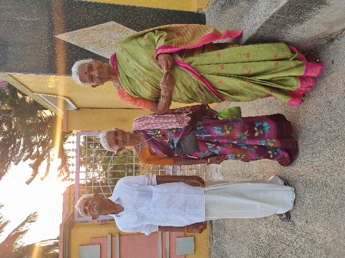 The image depicts three elderly individuals standing outdoors in Kammavaripalli, India, under late afternoon sunlight
