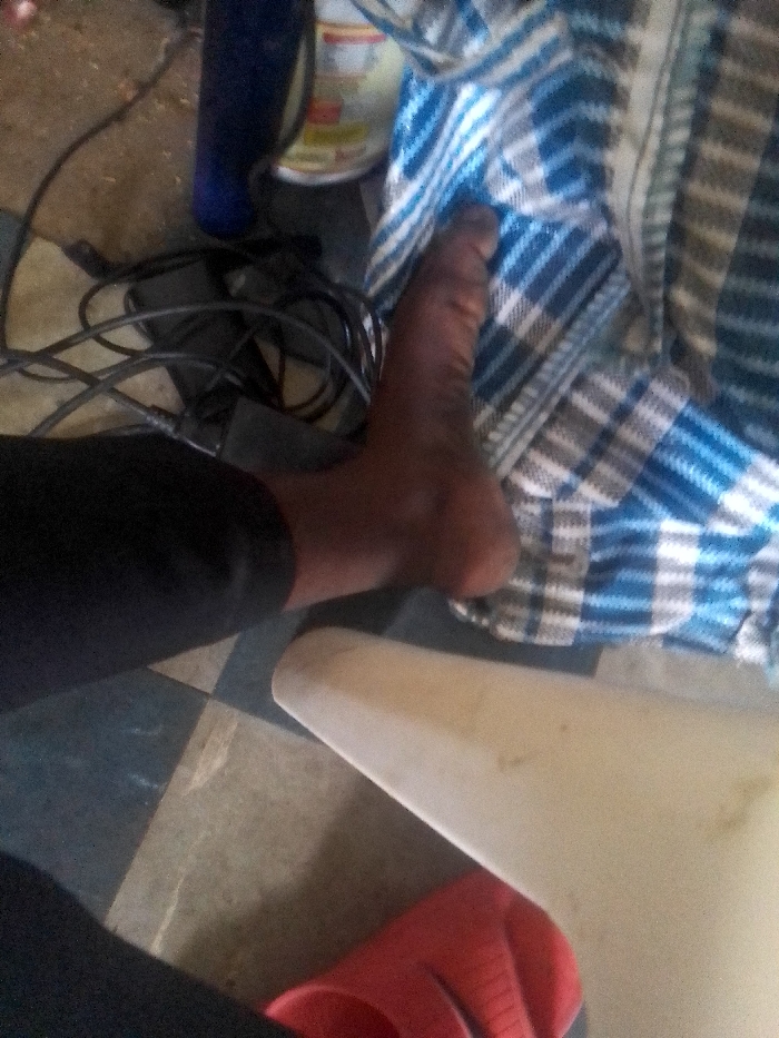 lower portion of a person's body. The individual is wearing black pants and has their foot resting on a blue and white striped blanket. The foot is bare. There is a white plastic surface in the foreground and a tangle of black cords and wires. An unidentifiable red object is in the lower right corner. The floor appears to be made of square tiles. The coordinates provided place this scene in Kajola, Nigeria.