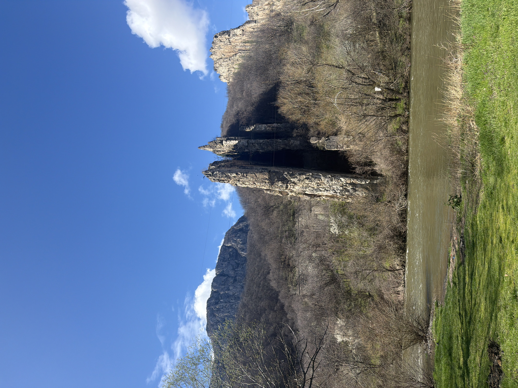 This image depicts a natural landscape located in the vicinity of Lyutibrod, Bulgaria. The upper half of the frame is dominated by a clear, bright blue sky with scattered white cumulus clouds. In the midground, a wide river with murky, olive-green water flows from left to right, exhibiting surface ripples and currents. The immediate foreground consists of a vibrant green grassy bank on the left, with some drier patches of grass and soil. Small, indistinct items, including a blue wrapper, are visible as refuse near the water's edge on the foreground bank. Beyond the river, a mountainous terrain rises steeply. The central-right portion of the scene features two prominent, weathered, light grey-brown vertical rock formations, characteristic of the "Rittles," towering over the landscape. A larger, craggy grey mountain face is visible on the far left. The mountain slopes and areas along the river are densely covered with deciduous trees and bushes, predominantly bare, indicating a late winter or early spring season. Scattered patches of light green foliage and white blossoms are discernible among the trees. Thin, dark power lines are visible spanning horizontally across the mid-upper section of the image, traversing in front of the rock formations and forested hills. A white object, possibly a plastic bag, is entangled in a bare tree branch on the far side of the river. No human figures or animals are visible within the frame.