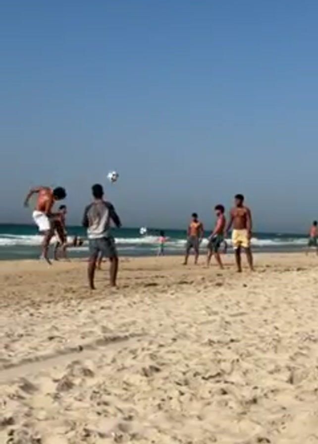 On a bright, sunny day, a group of approximately eight young men play soccer on a sandy beach next to a calm ocean. Most are shirtless and wearing shorts or swim trunks. The sky is a clear blue. Two soccer balls are visible. People are dispersed across the sand, kicking and passing the ball.