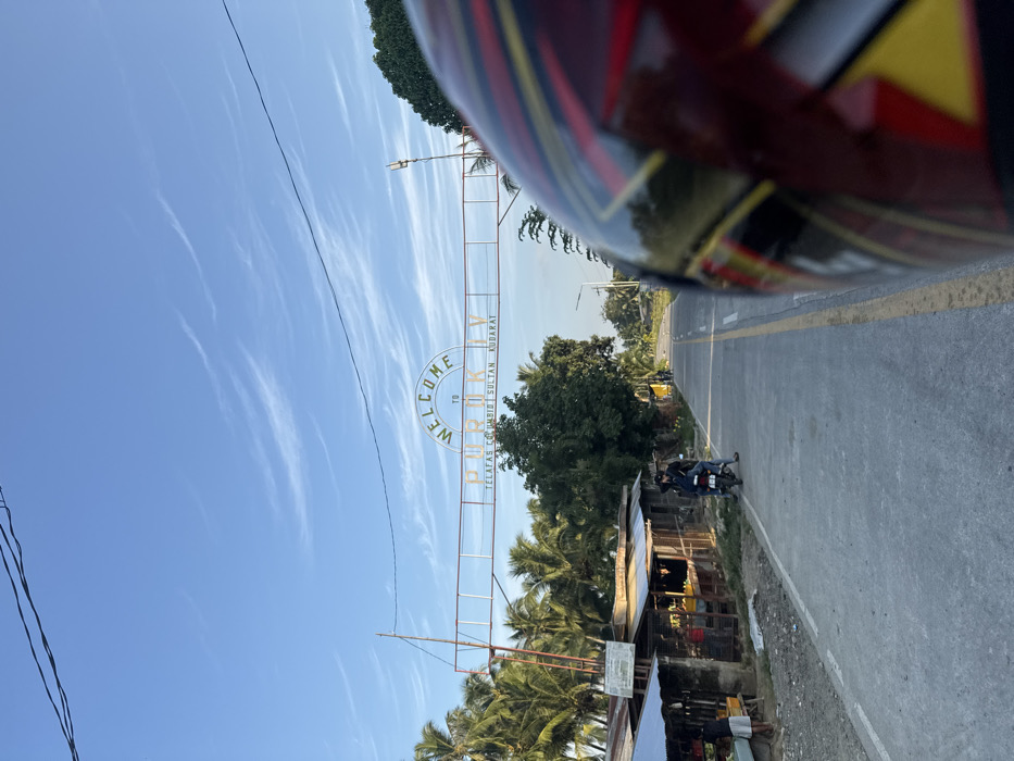 The scene depicts an outdoor daylight view in Purok IV, Telafas, Columbio, Sultan Kudarat, Philippines, under a blue sky with scattered wispy clouds. A white metal archway, displaying the gold text "WELCOME TO PUROK IV" and "TELAFAS COLUMBIO SULTAN KUDARAT," spans the paved roadway. To the left of the road, several rustic market stalls with corrugated metal roofs are visible, backed by dense tropical vegetation including numerous palm trees. Two individuals are present on the left shoulder of the road near the stalls; one is seated on a dark motorcycle, and another stands adjacent to it. The road itself is concrete, featuring a distinct yellow double centerline and white edge lines. Multiple indistinct human figures are visible further down the road in the distance. The lower right foreground is occupied by a red and black patterned motorcycle helmet, indicating the perspective of the observer. Utility poles and overhead wires are visible on the left side, with a street light pole on the right.