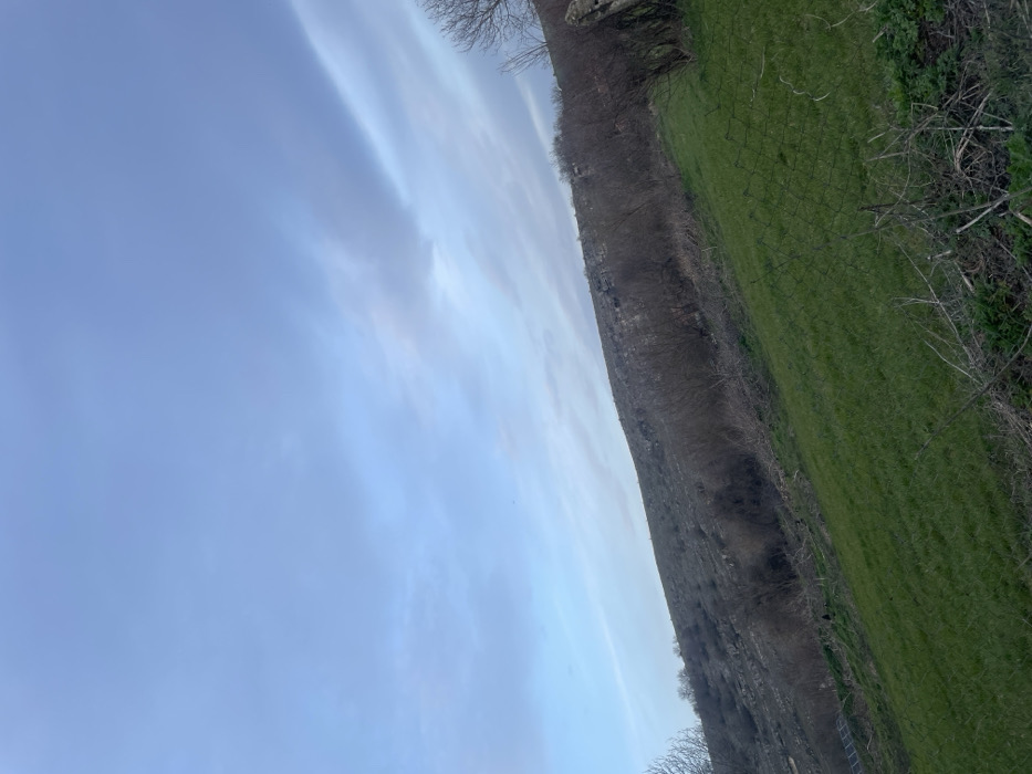 The image depicts an outdoor, sloped landscape within the vicinity of Topchii, Bulgaria. The scene is dominated by a large, rocky, barren hillside occupying the upper-midground and background. Its surface exhibits visible rock formations and sparse, low-lying vegetation. A band of leafless deciduous shrubs and small trees runs horizontally across the midground, situated at the base of the rocky incline. The foreground consists of a vibrant green grassy slope, indicating active vegetation. Scattered dry brush and bare branches are present in the immediate lower foreground, particularly on the right side. A section of wire mesh fencing is visible in the lower right quadrant, extending upward from the bottom edge. In the lower left quadrant, partially obscured by foreground grass, a segment of a solar panel array is visible, comprising multiple dark, rectangular panels arranged horizontally. Two small, dark, indistinct figures are discernible on the lower grassy slope, positioned to the left of the main shrub line. A third, smaller dark shape is visible further to their right, closer to the shrubs. Their exact nature cannot be definitively determined due to distance and resolution. The sky occupies the upper two-thirds of the image, characterized by an overcast condition with stratocumulus clouds, displaying a gradient from lighter blue in the upper left to grayer tones towards the upper right. Diffused light is present, consistent with an overcast daytime setting. The photographic perspective is an upward angle, looking across and up the slope, with the frame tilted slightly to the right.
