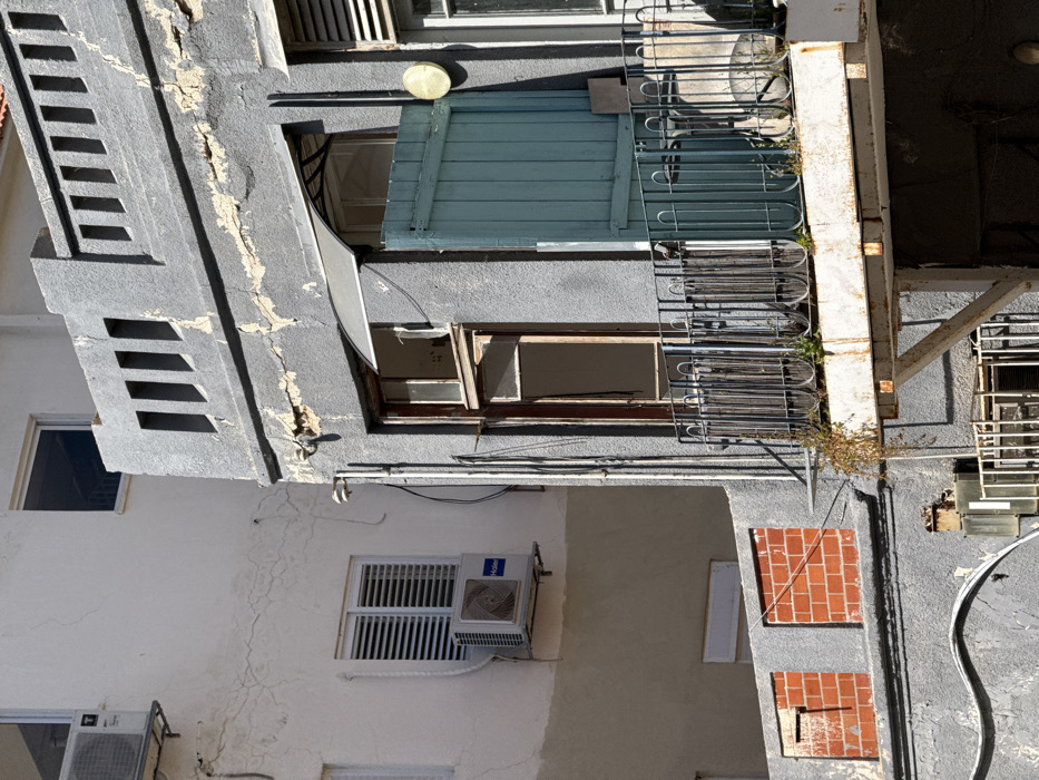 This image captures a close-up, angled view of aged urban architecture in Tel-Aviv, Israel, under bright sunlight