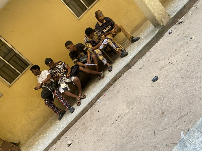 Five males are seated in a row along a light yellow building wall on a dirt ground surface in Ihiagwa, Nigeria