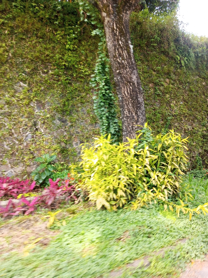 This image captures a section of a natural, vegetated environment within Palasari, Indonesia. A substantial stone wall, heavily covered with diverse green mosses, ferns, and small plants, dominates the background and upper midground. A tree trunk with dark, textured bark stands vertically, partially obscured by a thick vine with dark green leaves that tightly ascends its left side. At the base of the tree and extending to the right, a dense shrub characterized by bright yellow-green, elongated leaves is prominent. To the left foreground, several plants displaying dark red-purple foliage are visible. The immediate foreground consists of an area of short, light green ground cover or grass. No human or animal subjects are present. The scene is illuminated by natural daylight.
