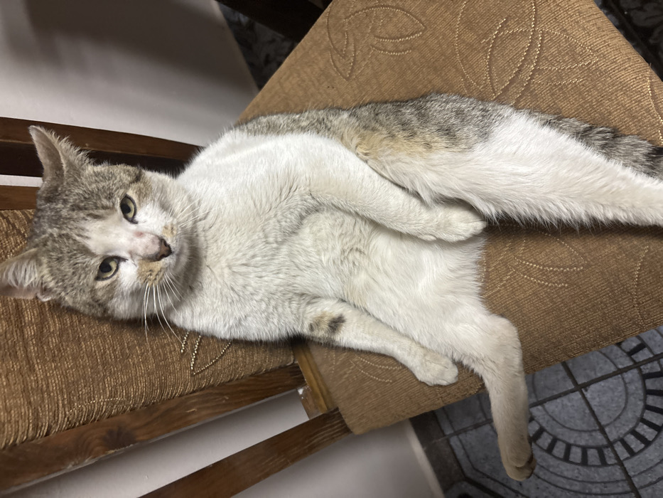 - "A domestic cat, predominantly white with grey and brown tabby markings, sits upright on a light brown upholstered wooden chair" by FM-naVU72, licensed under CC BY 4.0
