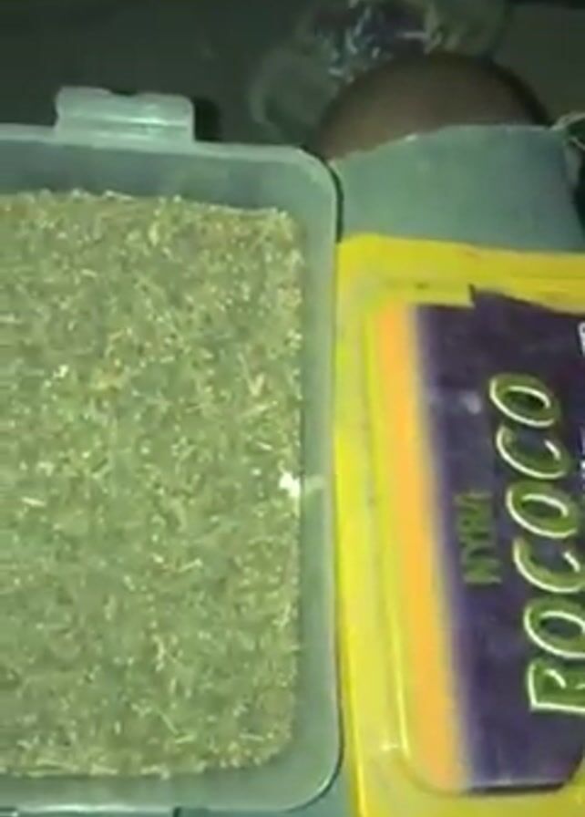 - ". The video shows a rectangular plastic container filled with what appears to be dried plant material, including seeds, stems, and leaves. The material is primarily light green and beige in color. Beside the container is a yellow and purple package of tobacco. The camera zooms in on the dried plant material, providing a close-up view of its texture and composition. Someone is heard speaking, but the content of the conversation cannot be fully understood from the video alone. The lighting is dim, suggesting the video was taken in a poorly lit environment." by FM-2K2SF3, licensed under CC BY 4.0