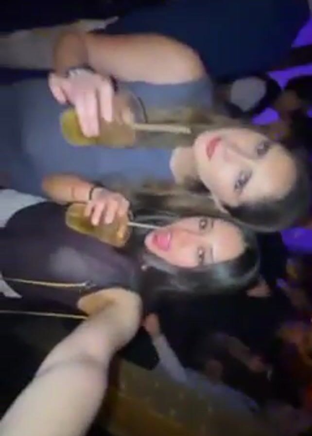 Two young women are taking a selfie in what appears to be a crowded, dimly lit nightclub. They are both holding plastic cups with drinks and straws, taking sips. The lighting includes blue and orange tones. Other people are visible in the background, and the atmosphere seems lively and energetic.