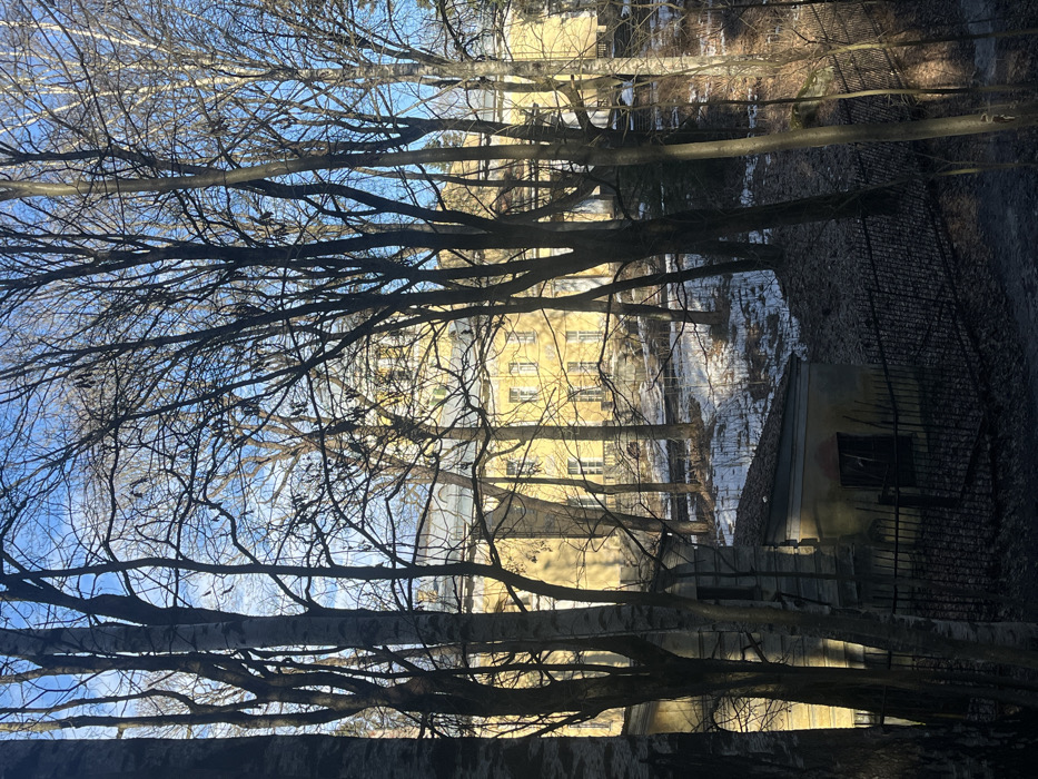 The image captures a winter scene depicting the Shuvalov Palace, a historical estate located in Pargolovo, Russia. The large, multi-story palace, painted a light yellow or cream color with white window trim, occupies the mid-ground and background. Its roof is grey, featuring a distinct central dome or cupola. Numerous bare deciduous trees, primarily dark in silhouette, dominate the foreground and mid-ground, partially obscuring the palace. Several dark birds are perched on the upper branches of these trees against a clear blue sky with some wispy clouds. The ground slopes downwards from the viewer, covered in patches of snow interspersed with dark earth or fallen leaves. In the lower-left foreground, a smaller, single-story utility building with faded yellow walls, a dark roof, and a dark, possibly broken, window is visible. A dark metal fence stretches horizontally in front of this smaller structure and across part of the mid-ground. Sunlight illuminates the scene, casting shadows from the trees onto the palace facade and the snowy ground. No human figures or discernible activities are present.