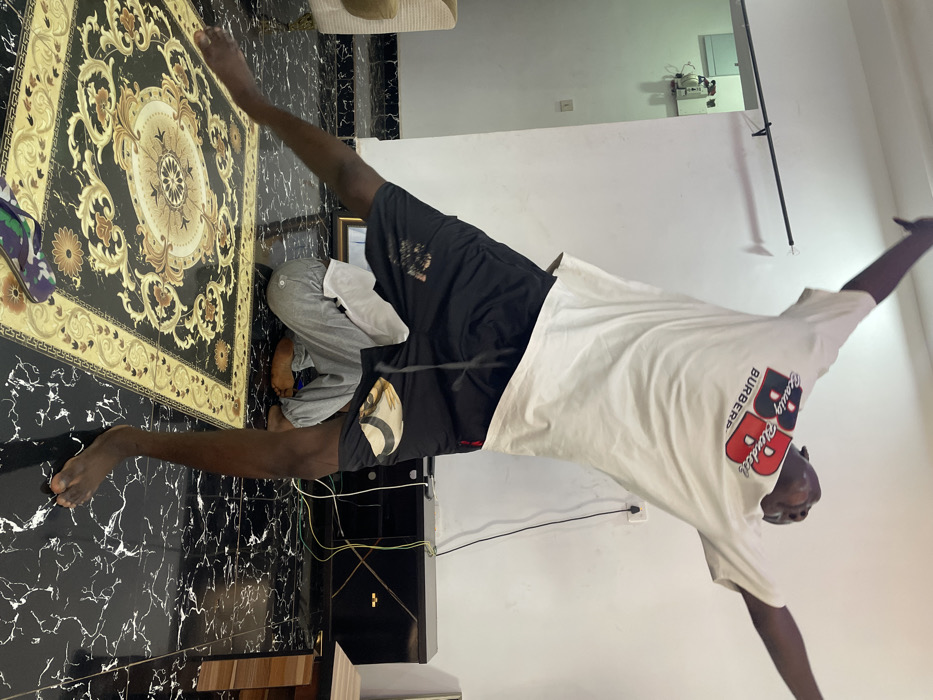 This image depicts an indoor scene in Idah, Nigeria, featuring two individuals within what appears to be a living space. In the foreground, a dark-skinned individual stands barefoot on a black and white marble-patterned tiled floor, with arms outstretched and raised, head tilted upwards and backward. This individual wears a white t-shirt with "Beauty Blended BB BURBERRY" text in black and red, and black shorts with a grey drawstring and a light-colored patch on the left thigh. On the floor beneath this individual, a large rectangular rug with a gold, black, and cream ornate pattern is visible. A pair of camouflage-patterned flip-flops rests on the tiled floor near the rug. Partially obscured behind the first individual's legs, a second person is seen sitting or kneeling on the floor, facing downwards, wearing grey sweatpants and a light-colored top, also barefoot. The walls are plain white. To the left, a light-colored armchair is partially visible, and a black rod is mounted horizontally on the wall above a white electrical box with tubing in a recessed doorway. To the right, a dark low cabinet or TV stand is positioned against the wall, with various cables (green, yellow, black) connected to a wall outlet above it. A portion of a light brown wooden table is visible further to the right.
