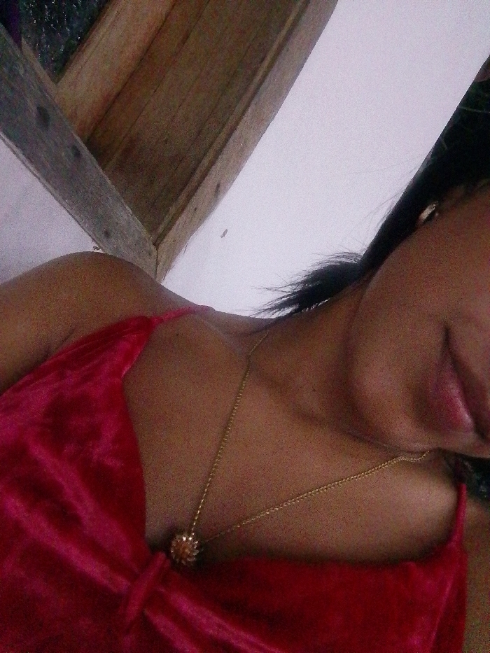 The image presents a close-up, oblique view of an individual's upper torso and partial head in an indoor setting, reportedly in Los Chacos, Venezuela. The subject, an adult with medium-brown skin and dark hair partially visible on the right side, is wearing a red garment made of a velvet-like material, featuring thin straps. A delicate gold-colored body chain is worn over the garment, traversing the décolletage and converging at a central, ornate, radiating medallion positioned on the upper chest. The visible portion of the face includes the right cheek, jawline, and part of the lips, which appear slightly parted. The background consists primarily of a plain light-colored wall, with a weathered wooden structural element visible in the upper-left corner of the frame. No explicit actions or interactions are depicted beyond the subject posing for the photograph.