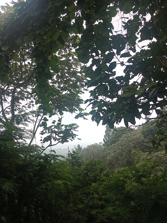 Lush green foliage dominates the scene, framing a distant view obscured by mist. Dense leaves and branches overhang, creating a natural canopy. Beneath, layers of vegetation cascade down a slope. Hints of buildings are faintly visible through the haze in the background. The overall impression is one of verdant wilderness and tranquility.