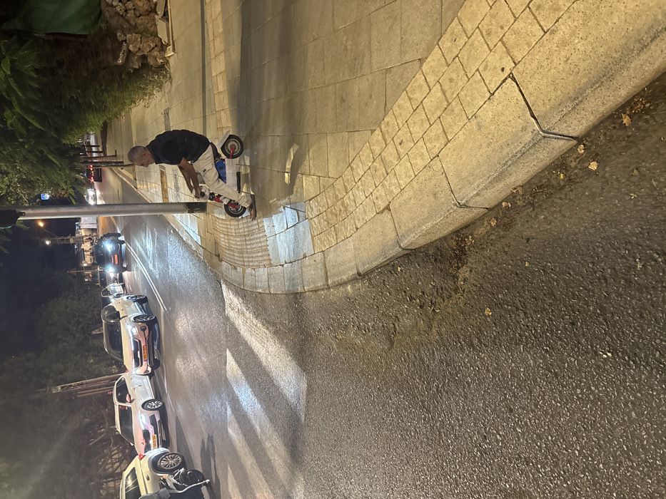 The image displays a nighttime street scene in Givatayim, Israel. A male individual, exhibiting short gray hair and a beard, is seated on a small, white and red electric scooter. He wears a dark short-sleeved shirt, light-colored trousers, and flip-flops, and is positioned on a light-colored, patterned concrete sidewalk. A utility pole stands immediately behind the individual. To the left of the sidewalk, an asphalt road features a discernible pedestrian crosswalk. Multiple vehicles are present on the road, including a white Kia Seltos and other SUVs with illuminated headlights, all displaying Israeli license plates. The vehicles appear to be in a lane of traffic, with one vehicle partially visible approaching from the distance. To the right of the sidewalk, an elevated, unpaved area contains dense foliage and exposed light-colored rocks. Street lighting illuminates the scene, casting shadows on the ground.