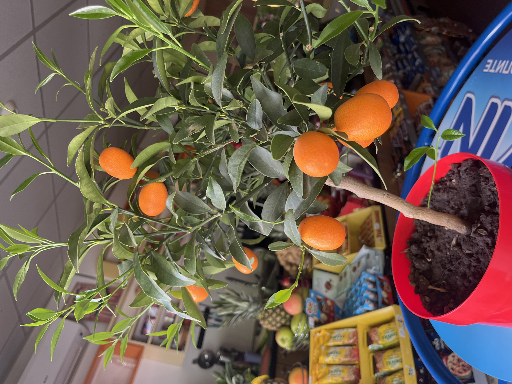 The image features a calamondin orange tree in a red plastic pot with dark soil. The tree has numerous small, bright orange fruits among its green leaves. The pot sits on a blue tray. The background includes a mix of items, including fruits like pineapples and apples, as well as packaged goods, suggesting the scene is indoors, perhaps in a store or kitchen. The location, Haskovo, Bulgaria, is specified, but there is no visual indication of the city in the image.