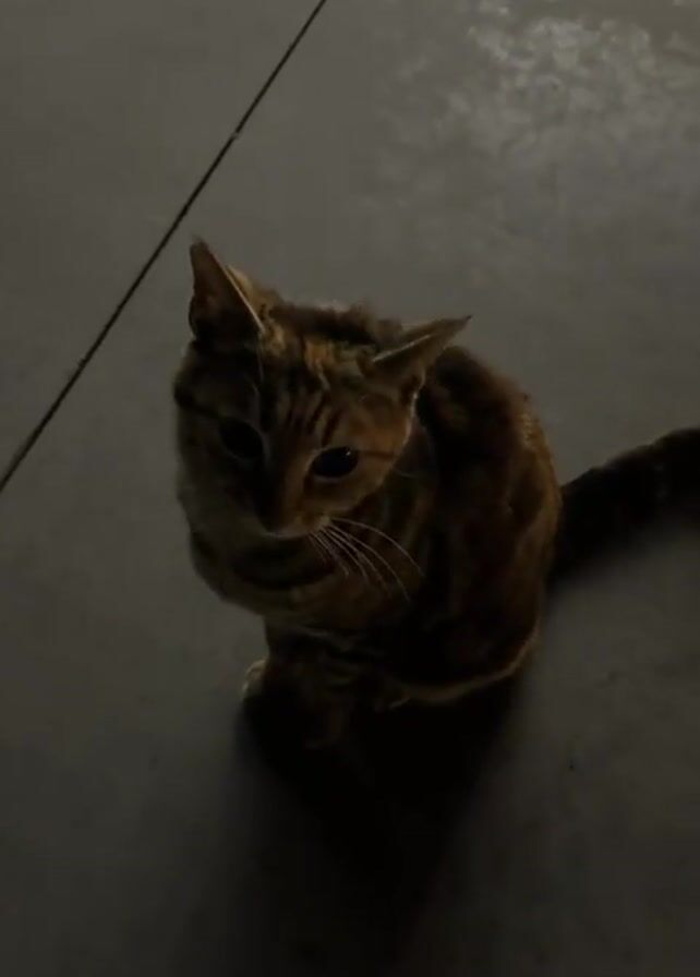 tabby cat sitting on a grey tiled surface. The cat is looking around, up and down, and then stares directly at the camera. The lighting is dim.