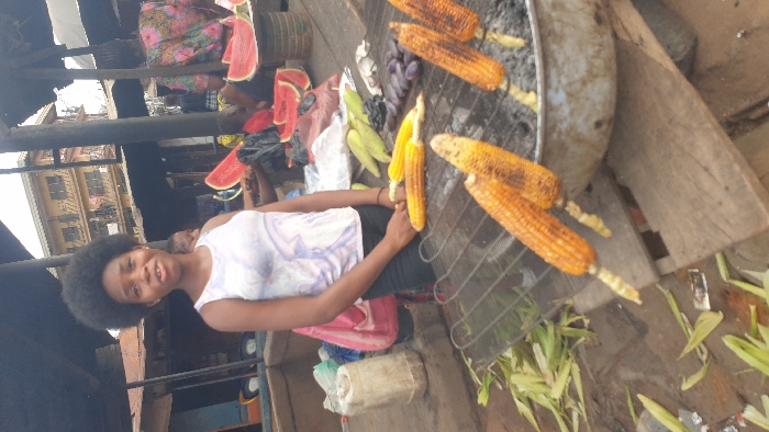 The image displays an outdoor market scene in Obosi, Nigeria. In the immediate foreground, a charcoal grill setup features a metal grate resting atop a dirty, light-colored metal basin filled with hot coals. Several ears of yellow corn, some with visible charring, are actively roasting on the grate. Additional ears are balanced on the grill's edge. The ground below the grill, composed of dirt, is littered with discarded green corn husks and leaves. The grill assembly is supported by crude wooden planks. A young woman with dark, curly hair is positioned centrally in the midground, standing behind the grill. She wears a white sleeveless top with a subtle pattern and dark shorts. She is smiling and directly facing the camera, her hands clasped in front of her. To her left, an off-white plastic jerrycan and a pink fabric bag are visible. Adjacent to her hands, on a surface, are several raw, unroasted ears of yellow corn and a cluster of small, purple-skinned vegetables. To the right of the woman, a market stall displays numerous slices of red watermelon and at least one whole watermelon. A person wearing a colorful, patterned top is partially visible behind this display. Further in the background, additional market stalls with dark, overhead coverings are present. Beyond these structures, a multi-story concrete building with multiple balconies and windows is visible. The sky is overcast.