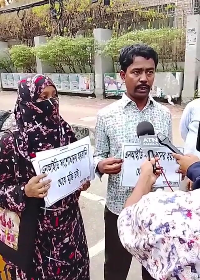 woman in a black floral print burqa with a face covering, and a man, holding signs, being interviewed by someone holding a microphone from an organization labeled "ATN". The signs appear to express a desire to be free from something, possibly related to an "NID". A second man stands behind the man being interviewed. The scene takes place outdoors, with a building and some greenery in the background. A couple of people are partially visible behind the interviewee. The interviewee is gesturing as he speaks into the microphone.