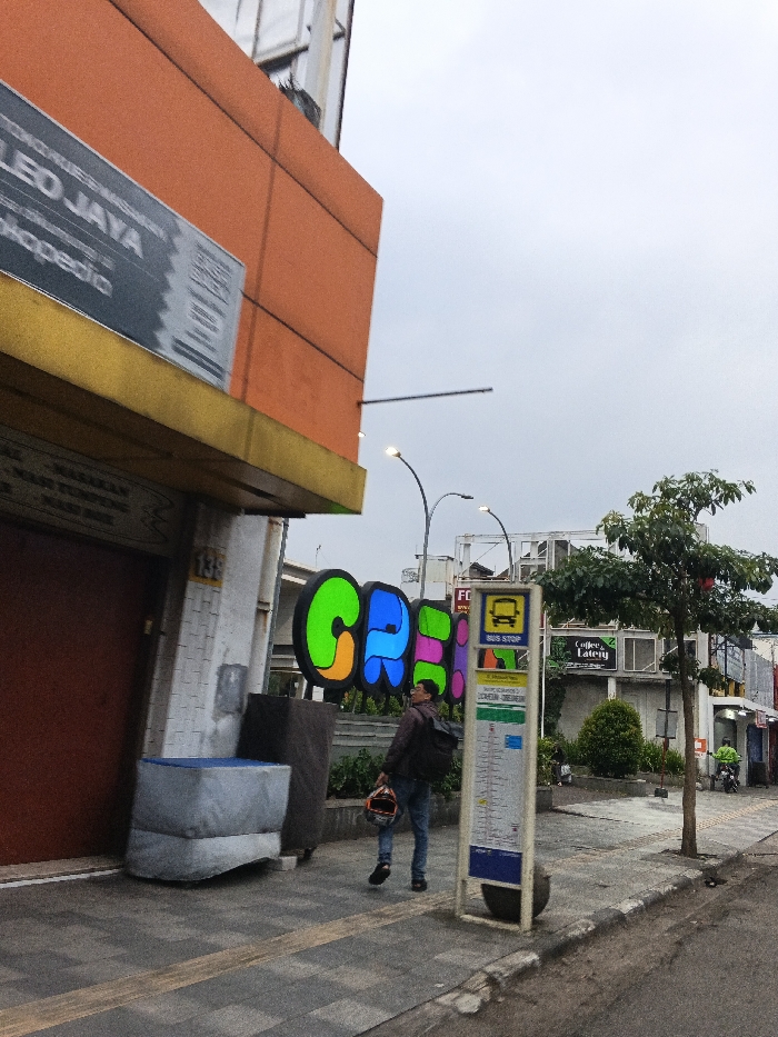 The image depicts an urban street scene on Jl. Pungkur No. 139, Bandung City, Indonesia, under an overcast sky. On the left, a building with an orange-paneled facade displays signage for "LEO JAYA" and "tokopedia". The building's address, "139", is visible on a concrete pillar. A male individual, wearing a dark jacket, blue jeans, and a black backpack, walks rightward on the concrete sidewalk, carrying a red-orange motorcycle helmet in his left hand. Adjacent to his path, a large, ground-mounted outdoor sign features multi-colored illuminated letters, appearing to spell "CREIO" or similar. Directly to the right of this sign, a bus stop signpost is present, displaying a bus icon, "BUS STOP", and vertical route information. Further right along the sidewalk, a small tree with green foliage stands. In the background, across the street, a building with a "Coffee Lateny" sign is visible. Streetlights illuminate the area, and a second individual on a motorcycle is partially visible in the distant background on the street.