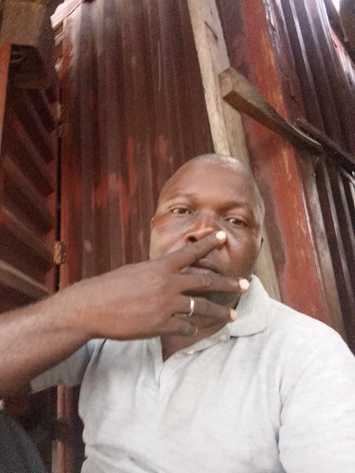 A man poses for a selfie, his hand raised to his face, fingers partly obscuring his mouth and nose. He wears a light gray polo shirt and a simple silver ring is visible on his finger. The background is a rusty, corrugated metal structure with wooden beams. The overall lighting is somewhat dim, creating shadows that accentuate the textures of the metal and the man's skin.