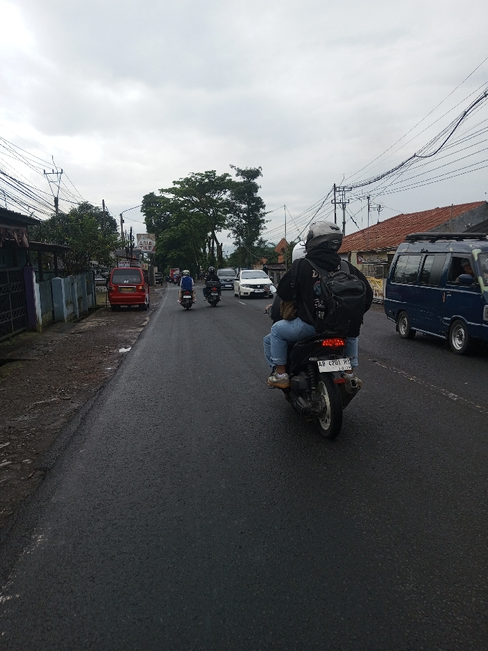 The image depicts a two-lane asphalt road, partially wet, under an overcast sky in Kamji Na-Yekha, Bhutan. In the foreground, a black automatic scooter carrying a driver and passenger is observed from behind. The driver wears a grey helmet, black hooded jacket, light blue jeans, and brown shoes, with a black backpack. The passenger wears light blue jeans and brown shoes. The scooter exhibits an illuminated red taillight and a license plate reading "AB 4701 RI." Ahead, two additional scooters, one dark-colored and one white, each with a helmeted rider, proceed down the road, followed by a white car. To the right, a blue minivan with a driver is in motion, paralleling the foreground scooter. The right side of the road features structures with reddish-brown tiled roofs and multiple utility poles supporting a dense network of overhead wires. On the left, a red minivan is parked on a dirt shoulder. Behind it, low concrete barriers, a dark metal fence, buildings with dark roofs, and a partial sign reading "ASIA TILE" are present. Utility poles with extensive overhead cabling and green foliage line the left roadside. Distant hills are faintly visible against the cloudy horizon.