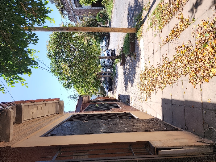 The image displays an outdoor street scene in the City of Unknown, Unknown, under a clear blue sky on a sunny day. In the foreground, a concrete sidewalk, significantly covered with dry, yellowish-brown leaves, extends from the lower left toward the mid-right. The left side features a building with a light tan lower wall and a darker brown textured upper wall, partially obscuring a dark security grille covering a window or doorway. A terra cotta tiled roof overhang with exposed concrete supports is visible above the building. A thin white cable runs along the base of the building. The midground reveals a paved street bordered by a narrow strip of earth with sparse green grass and a small tree within a square planter. Several vehicles, including white, silver, and dark models, are parked along the street. Multiple trees with green foliage line the street, casting shadows. A wooden utility pole stands on the right. The background shows more distant buildings and utility wires crisscrossing the sky. No individuals are present, and no specific actions or interactions are depicted within the frame.