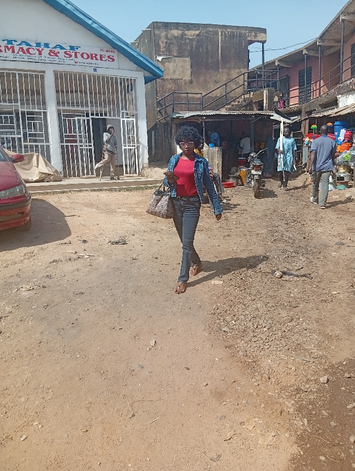 The image depicts an outdoor commercial street scene in Jos, Nigeria, specifically near Tafawa Balewa Street, Mutra Way, Off. JIB Jos, as indicated by signage for "TAHAF PHARMACY & STORES." The ground is unpaved, consisting of reddish-brown dirt and gravel under bright daylight, casting visible shadows. In the foreground, a Black female, estimated to be in her mid-20s to early 30s, walks towards the left of the frame. She wears dark sunglasses, a red short-sleeved top, a blue denim jacket, dark blue denim jeans, and brown sandals. She carries a patterned shoulder bag on her left arm and holds a smartphone in her right hand, appearing to look at the screen. To the left, a white building with a light blue sloped roof is visible, identified as "TAHAF PHARMACY & STORES" with barred windows and entrance. A partially visible red vehicle is parked in front of this building. Near the pharmacy entrance, a male figure in light-colored clothing and a hat is partially visible, holding what appears to be a walking stick or cane. In the midground and background to the right, a multi-story, weathered concrete building with black metal railings stands behind a row of lower commercial stalls featuring corrugated metal roofs. Various items, including brightly colored plastic household goods, are displayed outside these stalls. Several male figures are present: one in a light blue tunic walks towards the foreground, another in a blue t-shirt and light trousers walks away from the foreground, and other figures are visible within the market area. A motorcycle is parked on the unpaved ground between the main female subject and the commercial stalls.