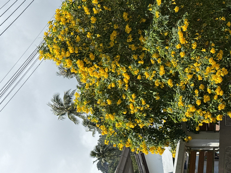 A verdant tree laden with bright yellow blossoms dominates the view, cascading over a building’s edge. Power lines stretch across the upper left. Palm trees punctuate the skyline in the distance, beneath a cloudy sky. The image is tilted, imparting a sense of slight imbalance.
