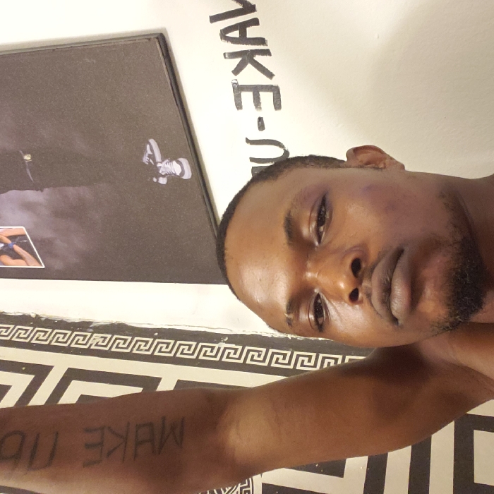 An adult male individual is depicted in an indoor setting within Okpanam, Nigeria. He is positioned centrally, facing directly towards the camera with a neutral expression. He has short dark hair, a light stubble beard, and a visible mark or discoloration on his left cheekbone below the eye. His left arm is raised and extended upwards, exposing the inner forearm which displays dark lettering spelling "MAKE ME". The background consists of a light-colored wall. To the left of the subject, a vertical strip of wallpaper or decal features a repeating black and white Greek key pattern. To the upper right, a rectangular dark-colored poster or artwork is affixed to the wall, displaying a cropped image of a person at the top and a pair of white and grey sneakers at the bottom. Below this poster, on the wall, black stenciled or painted text is visible, oriented upside down, which reads "MAKE-U-". The man appears to be taking a selfie.
