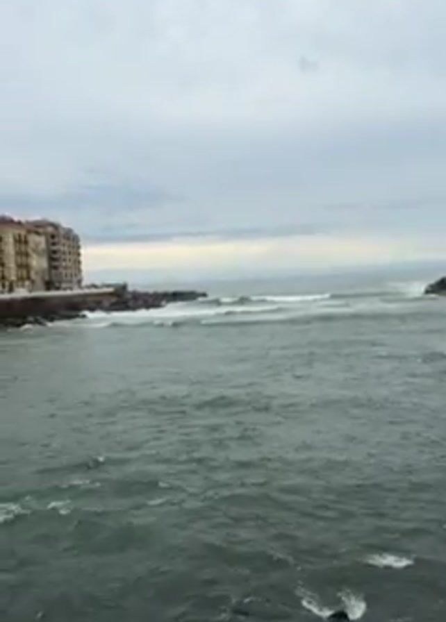The scene captures an expansive view of the ocean on a cloudy day. Waves are visible breaking on the surface of the water. To the left of the frame, there is a building constructed along the shoreline. The architecture appears to be multi-storied and constructed of brick or similar material. The sky is overcast and a uniform grey hue.